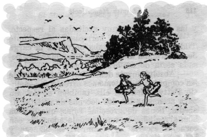 !Bee! !Bee! Aquellas dos niñitas harapientas, que trotaban colina abajo dejando atrás una nube de polvo, no parecían heroínas ni mucho menos. Tenían los pies descalzos, arañados y sucios; las manos rojas por las manchas de fresas, y sus caras pecosas brillaban de calor bajo sus sombreros. Pero Patty y Tilda se disponían a cumplir una buena acción, y absortas en su misión se dirigían presurosas a la estación, donde venderían fresas.