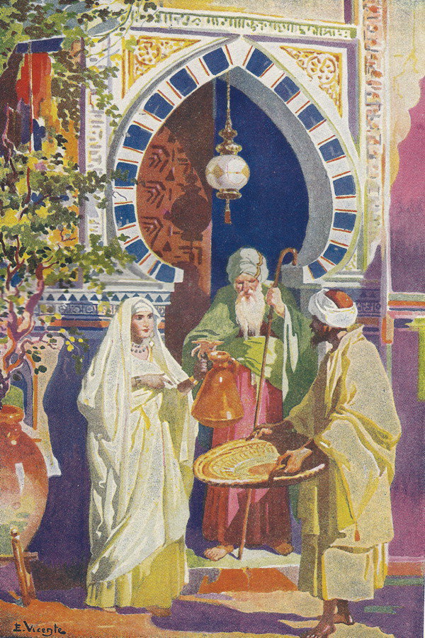Detúvose ésta primero delante de una puerta cerrada. Llamó, y un cristiano de aspecto venerable, de blanca y luenga barba, apareció en el umbral a recoger el dinero que le dió la dama, sin que ninguno de entrambos pronunciase la más mÃnima palabra. Pero el cristiano, que sabÃa muy bien lo que la joven deseaba, sacó un cántaro lleno de excelente vino.