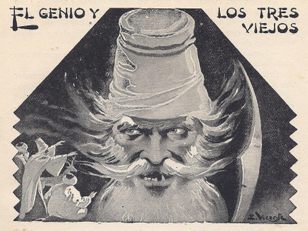 De repente, vieron a lo lejos un vapor espeso parecido a un torbellino de polvo impulsado por el viento, vapor que al acercarse a ellos se disipó dejando ver la figura gigantesca del Genio. Éste se aproximó con la espada en la mano al pobre mercader y le dijo, asiéndole de un brazo: