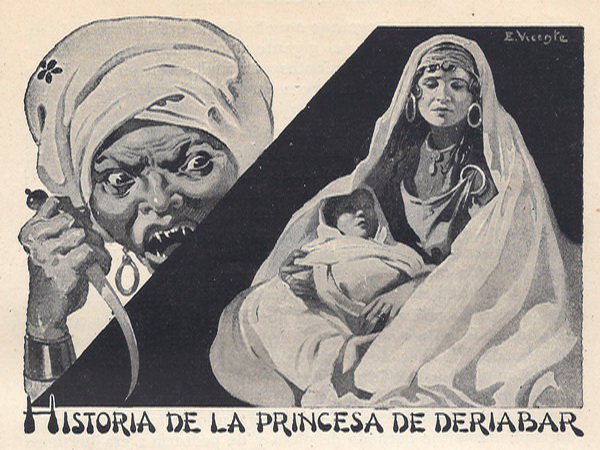 HAY en una isla una populosa ciudad llamada Deriabar, que durante largo tiempo fué gobernada por el rey virtuoso de quien soy la única hija. Un día que mi padre se entregaba a los placeres de la caza, vió un asno salvaje, y separándose de los demás, le persiguió con tal obstinación que sobrevino la noche y se encontró perdido en medio del bosque. Echó pie a tierra, y a poco divisó una luz hacia la cuál se dirigió en busca de asilo donde pasar la noche. La luz procedía de la hoguera encendida en una cabaña; un negro de gigantesca estatura estaba sentado delante de una enorme vasija llena de vino, asando en la llama de la hoguera un buey que acababa de degollar. En el fondo de la cabaña yacía tendida una mujer hermosísima sumida en la más lóbrega tristeza, y a sus pies tenía un niño de tres años que lloraba sin consuelo. El gigante engulló casi la mitad del buey, apuró todo el vino, y en seguida se dispuso a cortar la cabeza a la pobre mujer a pesar de sus súplicas y lamentos. Mi padre entonces disparó desde la puerta una flecha al negro, que cayó al suelo sin vida. Supo mi padre luego que aquella dama era la esposa de un príncipe de Sarracenos, y el gigante uno de los oficiales de su ejército, y que por resentimientos personales con su jefe había robado a la Princesa y a su hijo a fin de asesinarlos y satisfacer su sed de venganza.