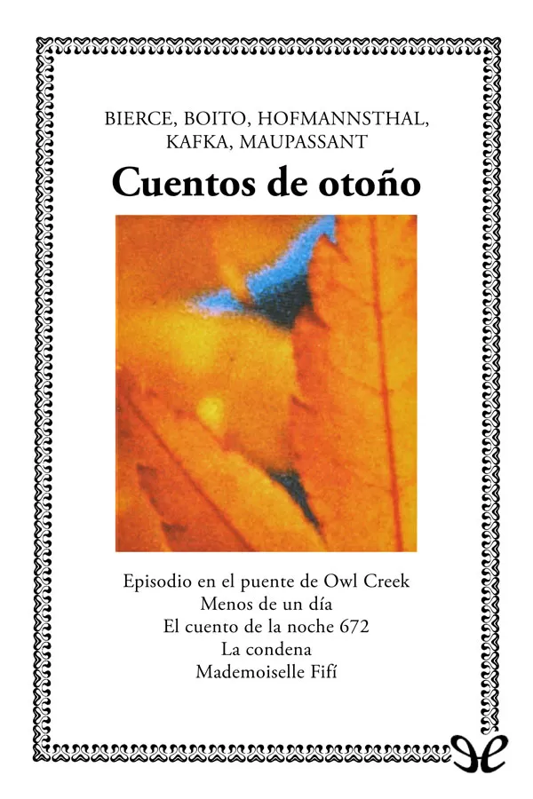 Cinco cuentos. Cinco autores que desarrollaron su actividad literaria entre dos siglos. Cinco formas de expresión en cuatro lenguas diferentes. El misterioso americano Ambrose Bierce (1842-1914); el arquitecto y crítico de arte italiano Camillo Boito (1836-1914); el austriaco que escribió una sorprendente «carta de renuncia» en plena actividad literaria, Hugo von Hofmannsthal (1874-1929); el checo universal Franz Kafka (1883-1924); el francés con dotes literarias de fotógrafo Guy de Maupassant (1850-1893).Contenido: ? Episodio en el puente de Owl Creek («An Occurrence at Owl Creek Bridge», 1891), Ambrose Bierce ? Menos de un día («Meno di un giorno», 1883), Camillo Boito ? El cuento de la noche 672 («Das Märchen der 672. Nacht», 1895), Hugo von Hofmannsthal ? La condena («Das Urteil», 1913), Franz Kafka ? Mademoiselle Fifí («Mademoiselle Fifí», 1882), Guy de Maupassant